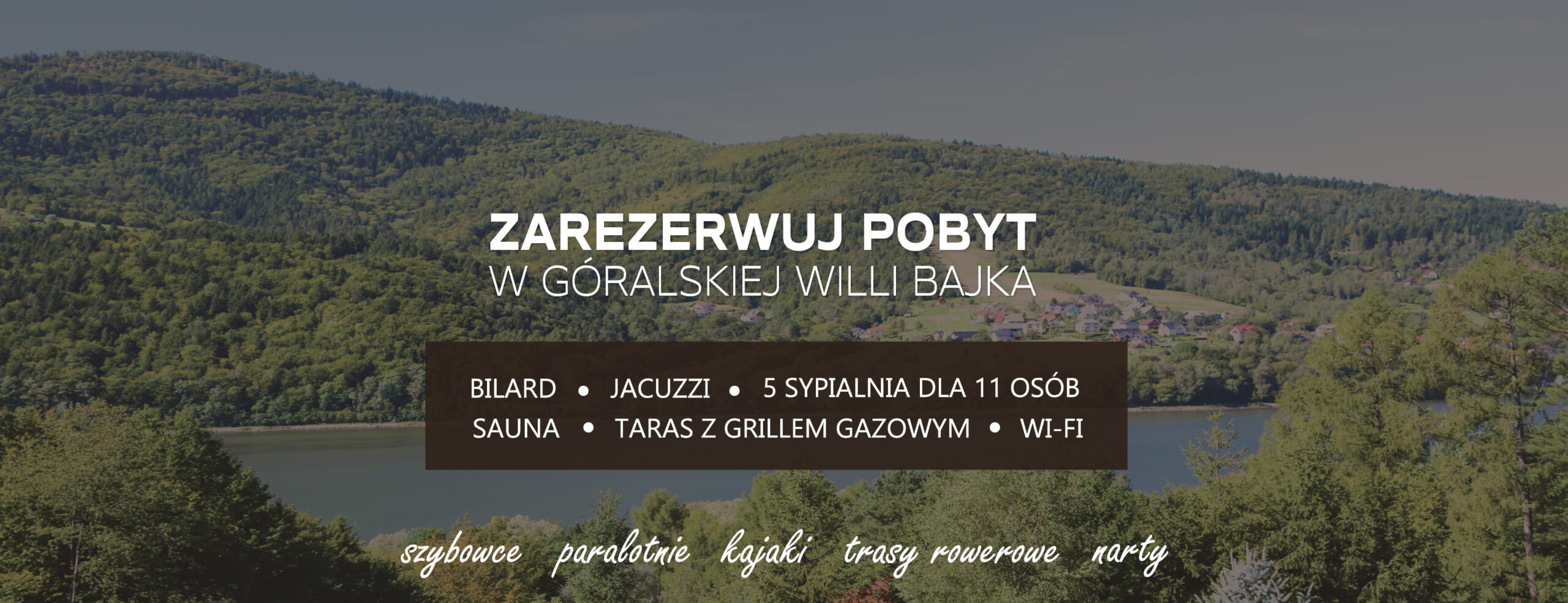 Góralska Willa Bajka to drewniany dom w góralskim stylu na zboczu góry Żar zaledwie 300 metrów od kolejki. Willa wykończona jest w wysokim standardzie z salonem z kominkiem oraz w pełni wyposażonym aneksem kuchennym, 5-cioma sypialniami, strefą SPA i relaksu oraz mini placem zabaw dla dzieci. Gwarantuje komfortowy wypoczynek dla 10 – 11 osób. Góra Żar to miejsce dla osób lubiących aktywnie spędzać wolny czas. Oprócz pieszych wycieczek po Beskidzie Małym miejsce oferuje niezliczoną moc atrakcji sportowych. Budynek sąsiaduje z trawiastym lotniskiem szybowcowym, na którym miłośnicy podniebnych lotów mogą odbyć turystyczny lot szybowcem, uprawiać paralotniarstwo lub skorzystać z komercyjnego lotu tandemem tuż nad dachem Willi Bajka.